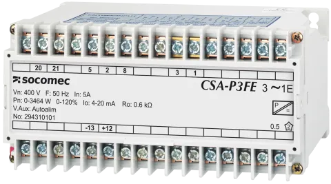 | Description | Transducteur CSA-P3FNE entrée : 400V, 5A sortie : 4-20 mA, 0-10 VDC, 230 VAC alimentation auxiliaire Transducteur convertit un paramètre électrique en un signal DC |