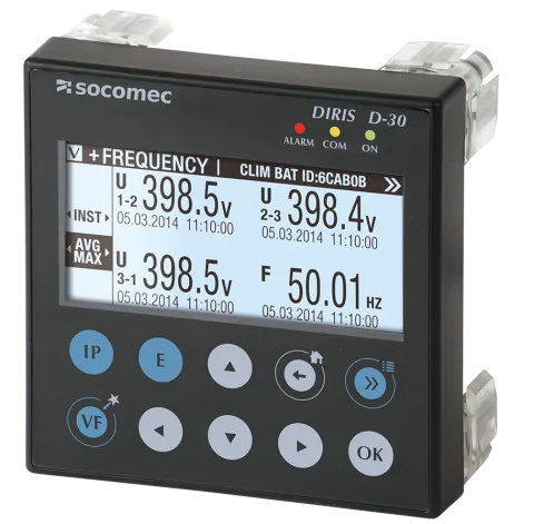 Description Puissancemètre multifonction DIRIS D-30, afficheur monopoint pour modules DIRIS B PMD et DIRIS Digiware I-4x, 96x96 mm, ports de communication RJ9 - USB, fonctionne avec les capteurs de courant intelligents RJ12
