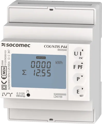 | Description | Compteur d’énergie active modulaire COUNTIS P44 certifiés MID Triphasés sur TC 1 et 5A, ports électriques de type M-BUS, totalement intégrés à l'écosystème SOCOMEC comprenant : Webview/écrans/passerelles/logiciel de configuration |