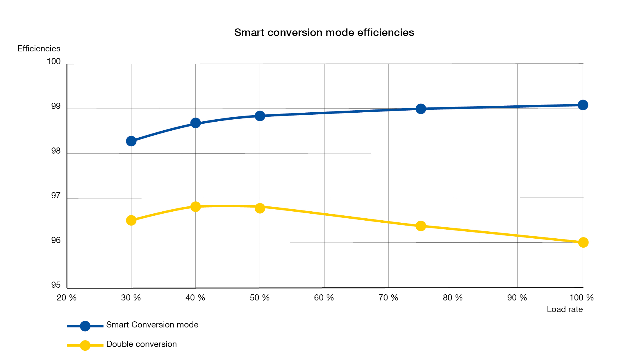 Met een efficiëntie van bijna 99% bij een belastingsniveau van 50% levert de Smart Conversion-modus aanzienlijke energiebesparingen op, tot wel 350 MWh per jaar, waardoor warmteontwikkeling, koelingskosten en CO2-uitstoot worden verminderd. Dit vertaalt zich in een directe vermindering van de bedrijfskosten (OPEX) en een verbeterde duurzaamheid van de fabriek.